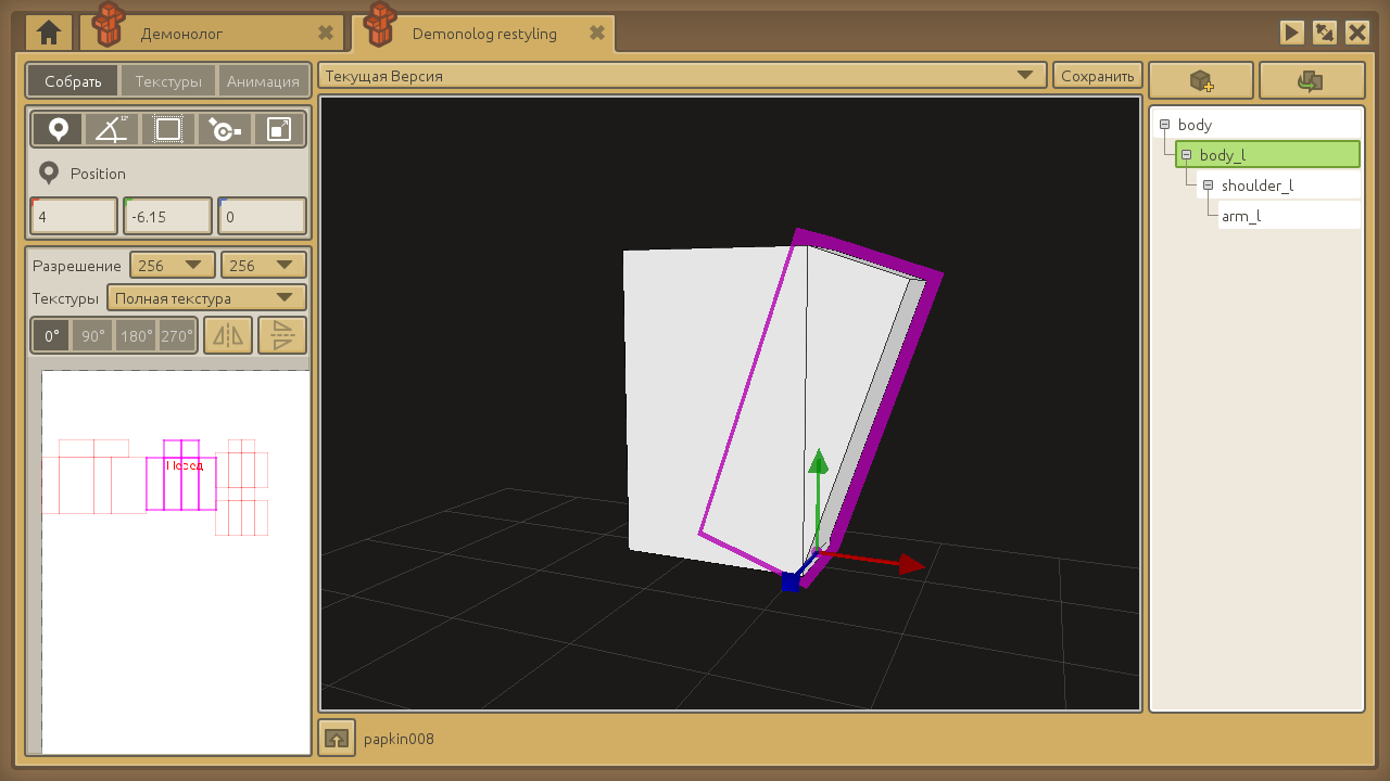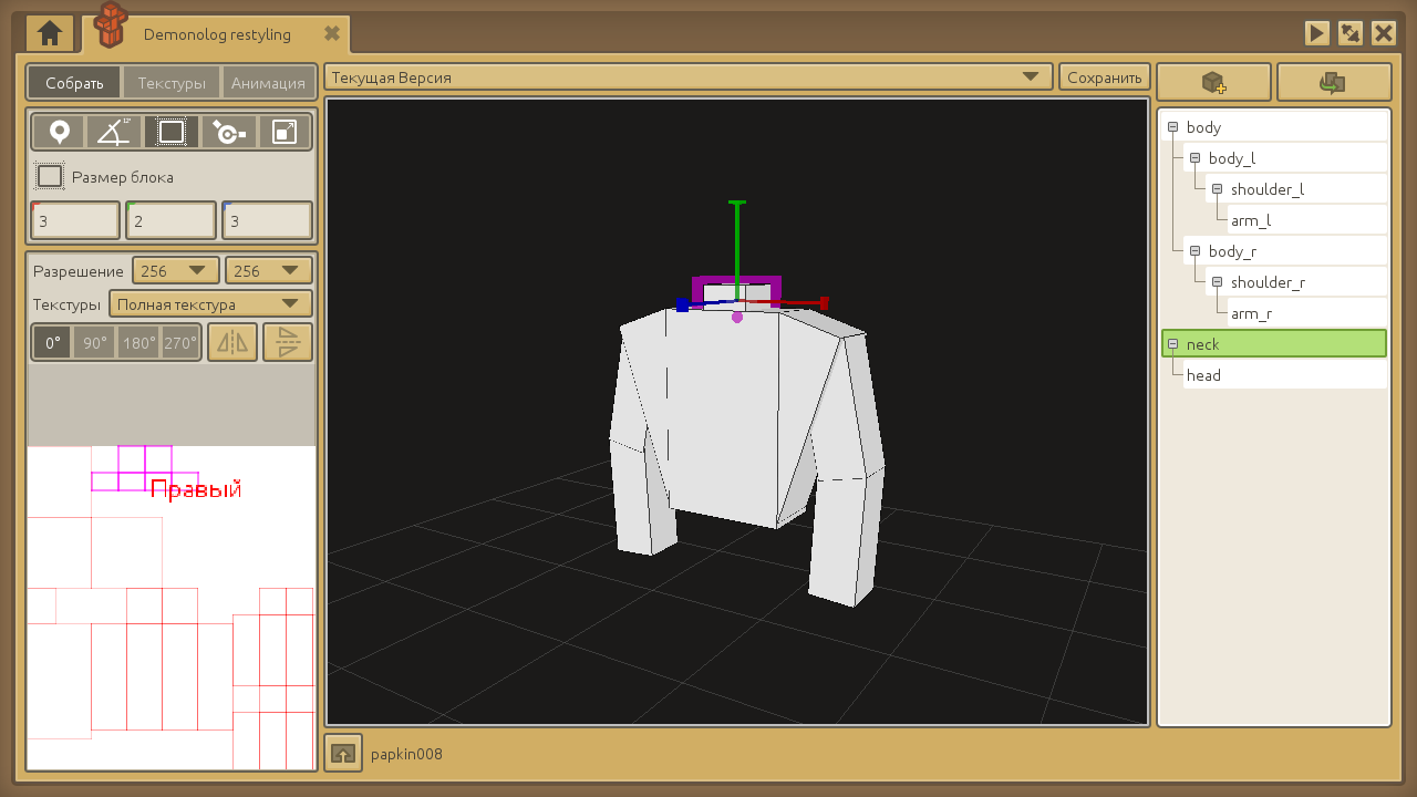 Почти все модели живых существ начинаются с бокса "body", который является главным по отношению ко всем остальным частям: рукам, ногам, голове, аксессуарам. Для удобства текстуру следует сразу растянуть до 256х256, чтобы максимально увеличить рабочее пространство и позже свернуть ее до использованной части. Развертки необходимо размещать без нахлеста одной на другую и, максимально избегая, образования больших запутанных куч (представлены на скриншоте, на котором можно увидеть и вторую ошибку -- одинаковые названия у разных боксов, чего следует не допускать).