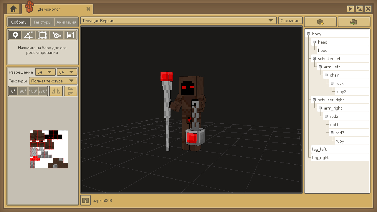 Готового Демонолога с учетом Ваших предложений можно будет увидеть в отдельном абзаце будущих статей, которые хотелось бы посвятить построению анимаций, созданию блоков, предметов и другим интересным темам.
