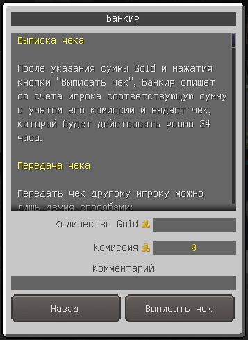 В этом диалоге он указывает количество Gold (от 10 до 99999), на которое выписать чек и комментарий (он отображается на самом чеке и потом попадает в историю операций с Gold). Комиссия вне зависимости от суммы составляет 5%, но не более 50 Gold. Для игроков с группой Platinum комиссия фиксированная и составляет 1 Gold.
