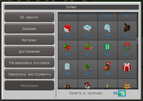 У Оллила добавлена возможность отправиться в новую локацию для участия в игре "Сбор подарков". Игра запускается один раз в сутки каждый день в течении всего ивента в заранее заданное время. Суть ивента - на карту заходят игроки и случайным образом делятся на стороны, одна сторона за Дед морозов играет, другая за эльфов (отличаются надетой броней). Каждой из сторон необходимо за отведенное время как можно больше натаскать подарков, которые спавняца на центре, в сундук своего дома. При этом игроки могут мешать друг другу, пуляясь снежками. За участие игрок получает валюту (открытки) равную количеству набранных очков. Если сторона игрока одержала победу, то количество полученной валюты удваивается.