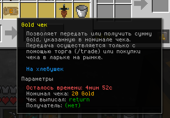 Все иные способы получения чека не изменяют текущего владельца и получить Gold по такому чеку будет не возможно. Если же игрок получил чек "легально", то он может нажать ПКМ с ним в руке и он будет тут же обналичен - Gold запишется ему на счет, а чек исчезнет.