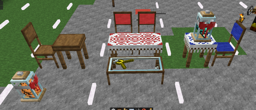 Журнальный столик - пол блока в высоту и 1 или 2 блока размером. В него может быть вставлен любой предмет, который будет отображен лежащим на столе. Не все предметы, которые можно вставить, будут отображаться настоле, если предмет не поддерживается, то игрок увидит вместо него костную муку.