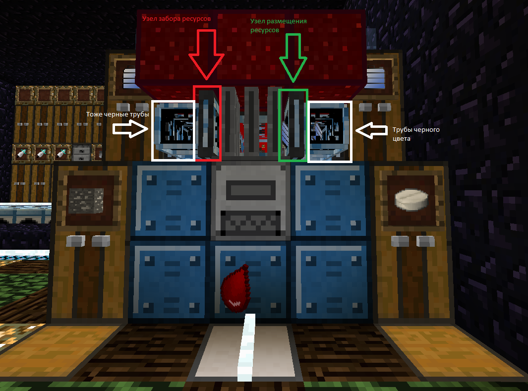 2. Далее берем трубы. Трубы рекомендую использовать: 4 одного цвета, 2 другого цвета. Так как трубы одного цвета будут соединиться и тем самым эстетичность останется под вопросом. Ставим по 2 трубы черного цвета(например) с одной стороны основного контейнера плутония(который идет по дефолту в печке) и 2 с другой. По бокам от дальней трубы ставим двойной шкаф. Справа у нас будет шкаф с полными канистрами для воды. Начнем с него. На дальнюю трубу, которая соприкасается с ящиком, ставим узел забора ресурсов(узел забора забирает из шкафа предметы). А на первом блоке трубы, который соприкасается с основным контейнером плутония, ставим узел размещения ресурсов(передает ресурсы в контейнер, а именно канистры с водой). Аналогичную процедуру проводим и слева, но в этом случае ресурсы уже должны забираться из основного контейнера плутония и передаваться в пустой ящик слева. То есть теперь узел забора ресурсов подключается к контейнеру плутония, а узел размещения к пустому ящику. Так важно помнить, что узлы(размещения и забора ресурсов) нужно настроить(ПКМ по узлу), а узел забора ресурсов еще и требует питания(активируется ред. кубами, кликнув по ним ПКМ). Но об этом чуть позже.