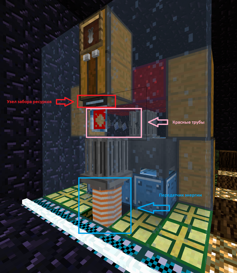 Теперь устанавливаем 6 ред. кубов над трубами так, как показано на скрине, жмем по всем ПКМ(чтобы не заморачиваться), если виднеются частицы ред. куба, то все отлично. Также возле узлов забора ресурсов будут частицы, которые говорят об их активности. С этим мы разобрались. Теперь переходим к плутониевым стержням.