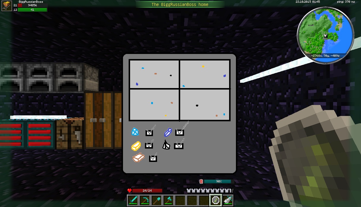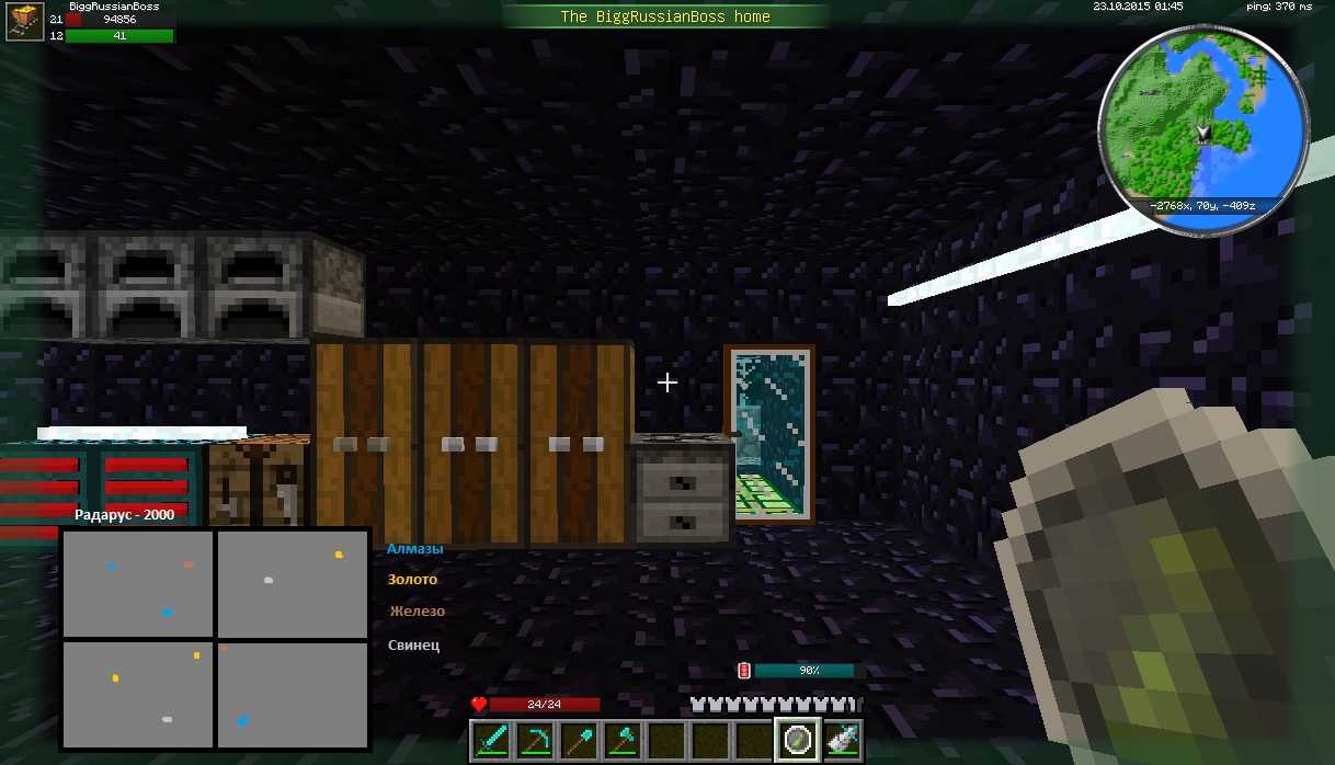 Принцип роботы: ( Сместить можно чуть выше, чтобы не мешало чату или чат чуть выше. ) Держа в руке именно радар, получаем "рамочку" слева снизу, на которой изображены цветные точки, тобишь наши ископаемые. Если убрать радар с руки, то и "рамочка" слева снизу пропадет. ( Высота указывается, чуть-чуть правее радара, маленькими буквами. К ближайшему: Алмазу, Железу, Золоту и Лазуриту. )