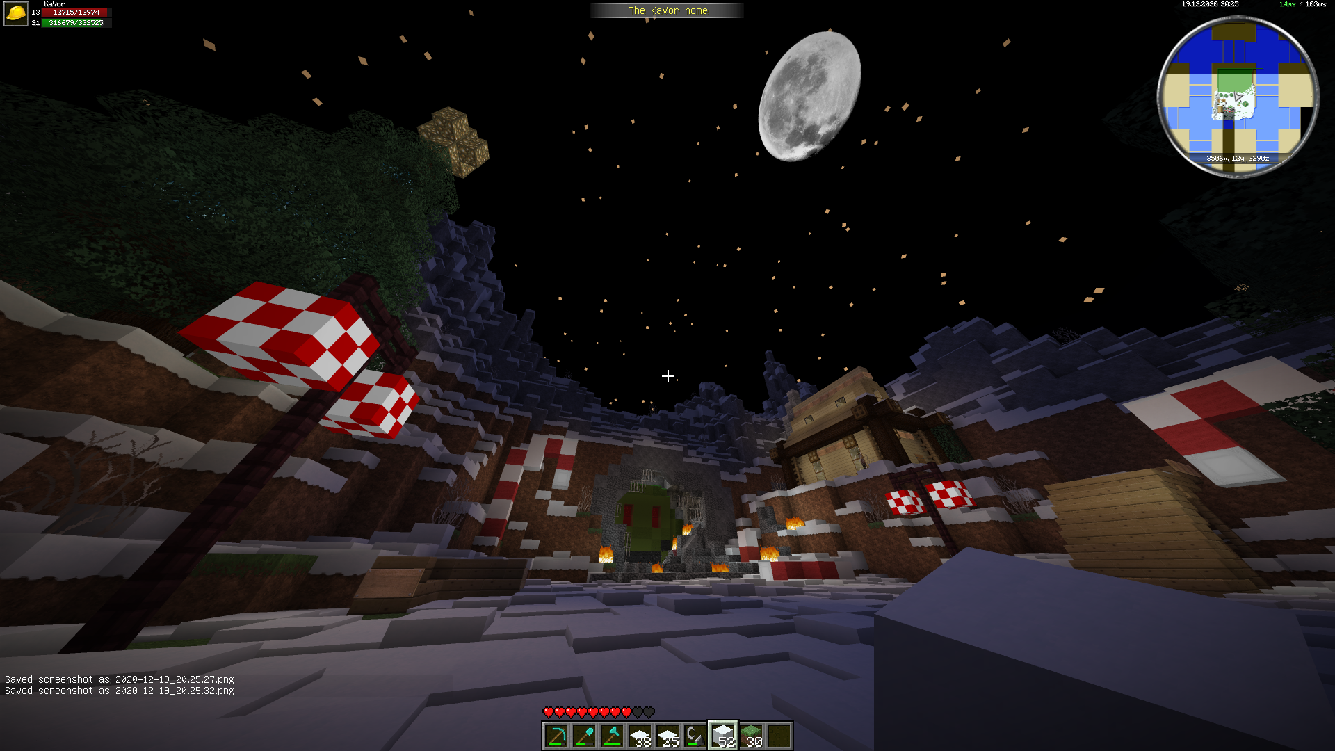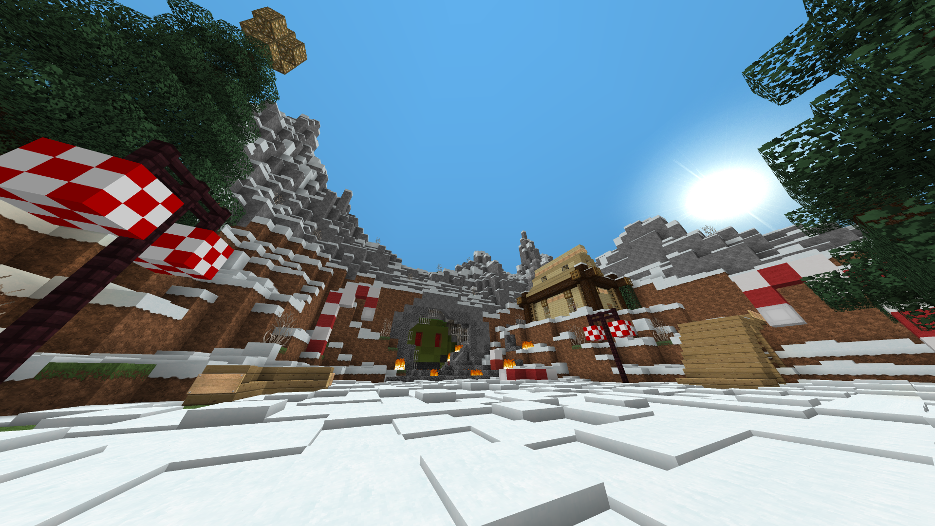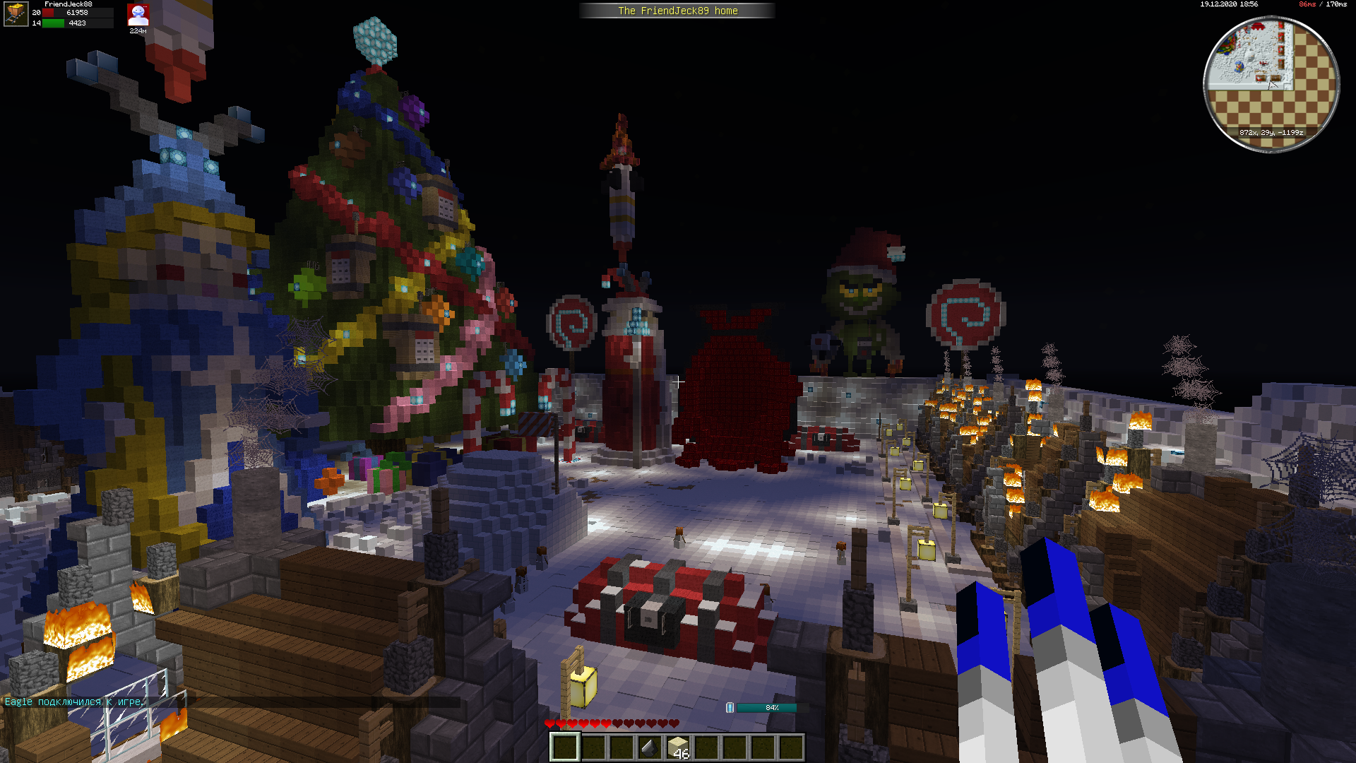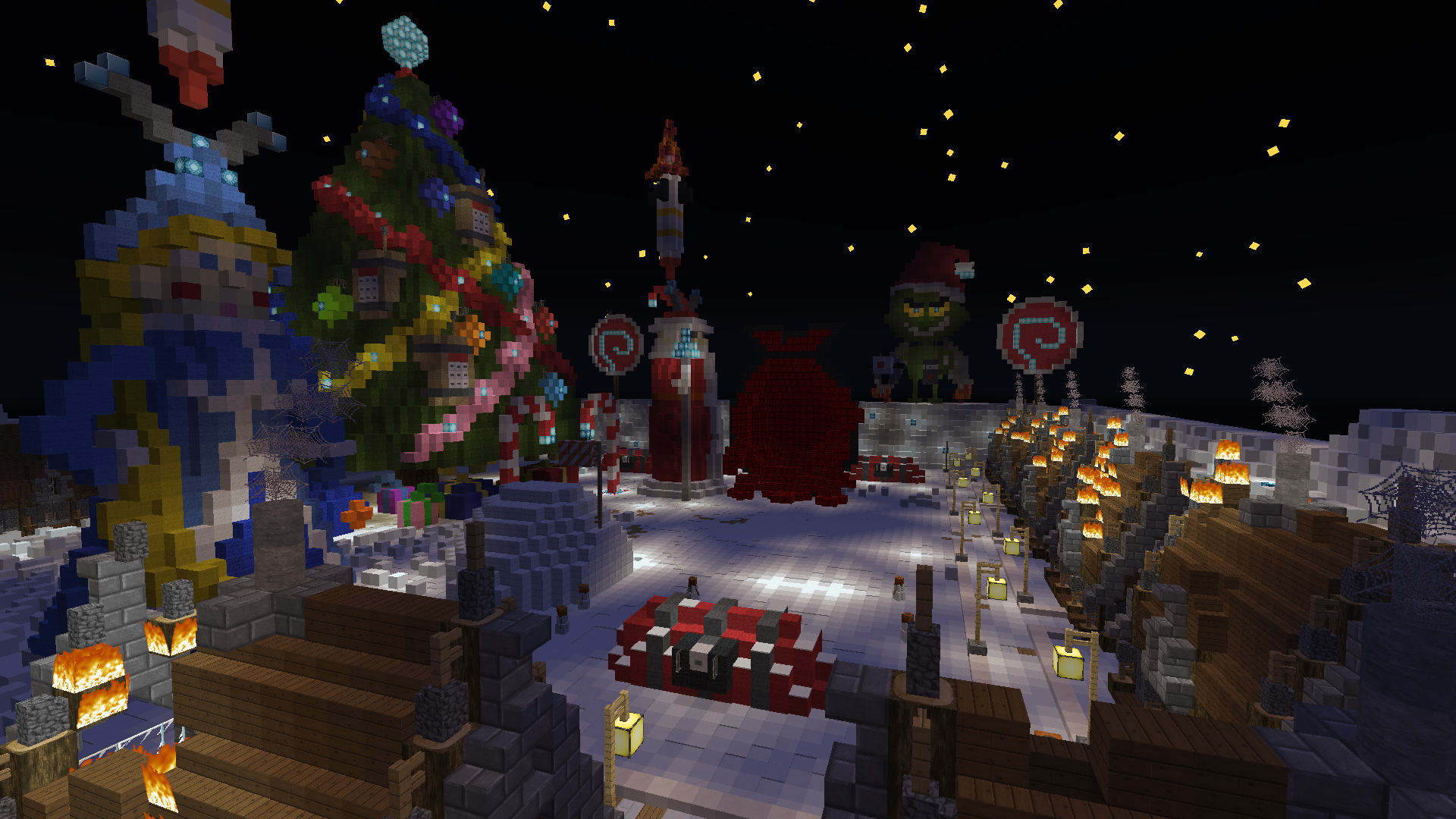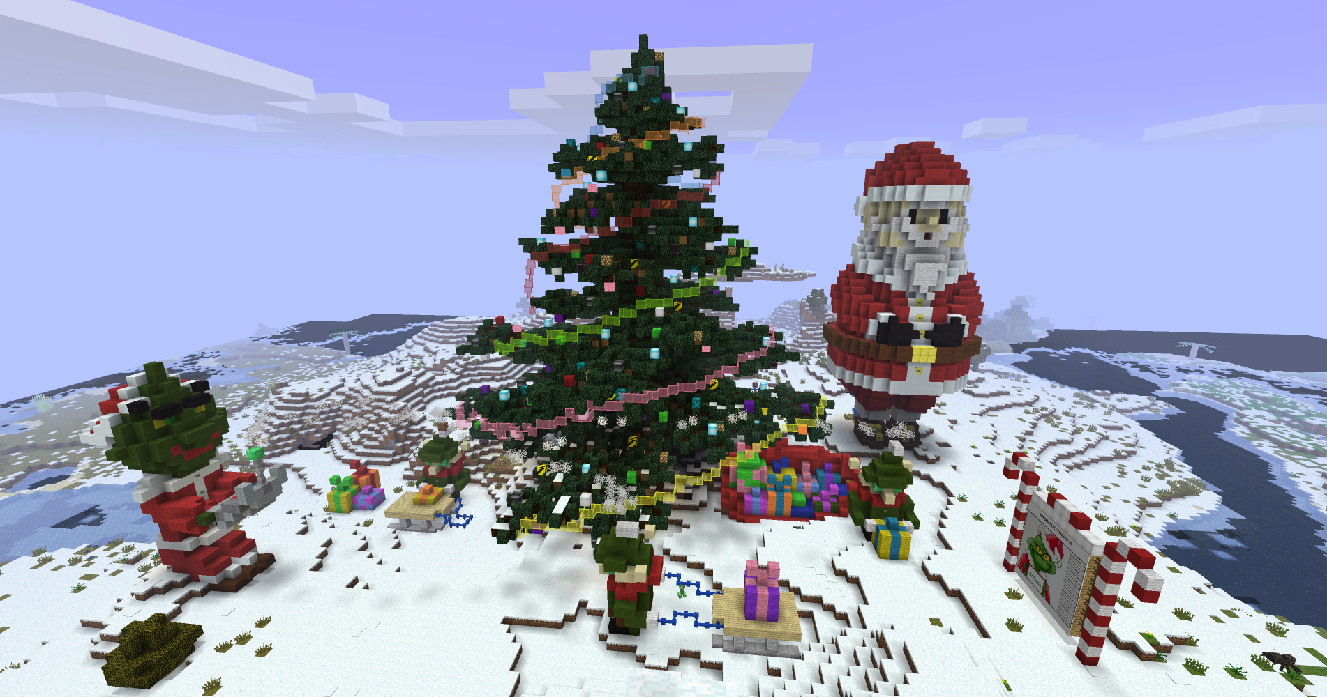 У меня была идея с концовкой истории про Гринча, когда он стал добрым, и план постройки для скриншота был в том, что Гринч стоя на горизонте кидает пушкой тнт которые приземляясь на землю раскрываются как книжка и из них появляются домики новичков, на переднем плане новички с изумленным выражением лица и все это в зимнем биоме. Но так впадлу, ребята..