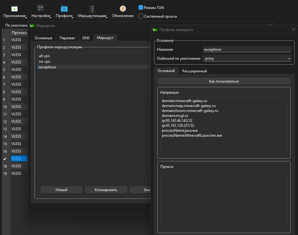 Обязательно включите режим TUN.