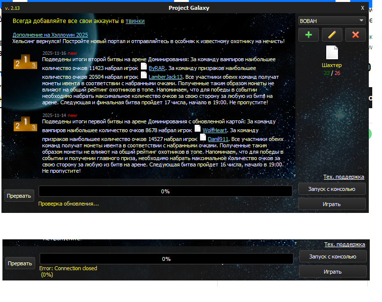 Программы для обработки трафика в фоне не работают? (Они могут так же приводить к сбою, внутри игры может приводить к ошибке zlib) Винда 7, программ никаких нет Редактировалось 1 раз(а), последний 2025-11-18 08:47:02 |