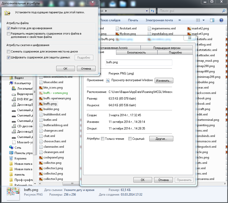 - Открываем "свойства" файла и выбираем "только чтение", "скрытый" и "шифрование". После этого нажимаем "ОК" и заходим в игру.