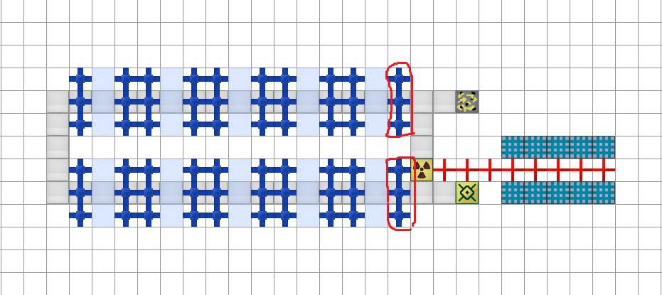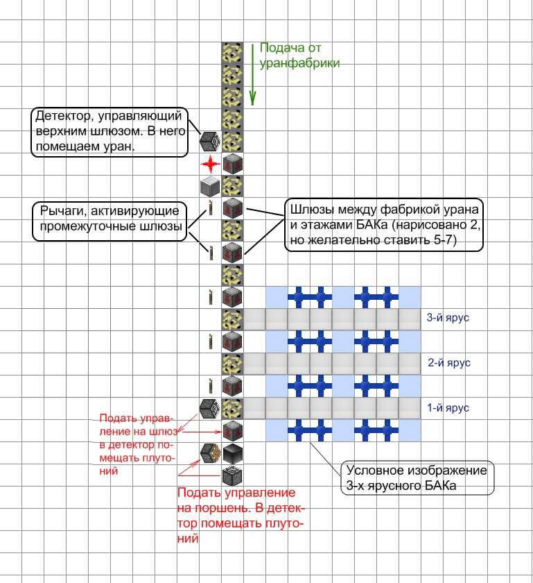 Под камерой синтеза самого нижнего яруса БАКа находится детектор, который управляет поршнем, выводящим плутоний на площадку накопления. Все ред-подключения простейшие и, думаю, каждый игрок справится с постройкой этих схемок.