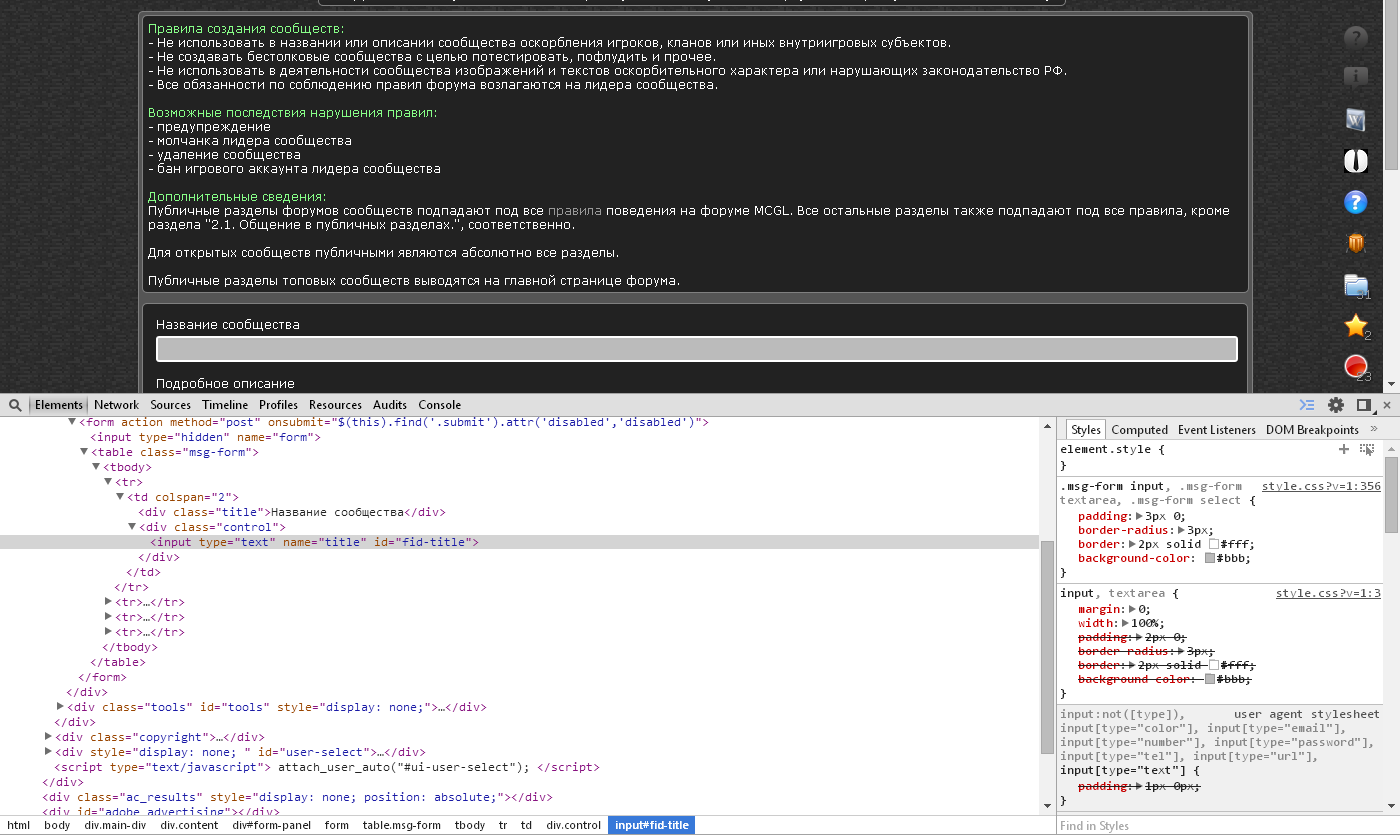 Если при создании кланов есть запрет на длинну (1-20) и символы (латынь, русский, цифры). То при создании сообщества ограничений вообще нету. Т.е. можно создать сообщество спамящае кучей спец символов. В итоге "рвется" форум.