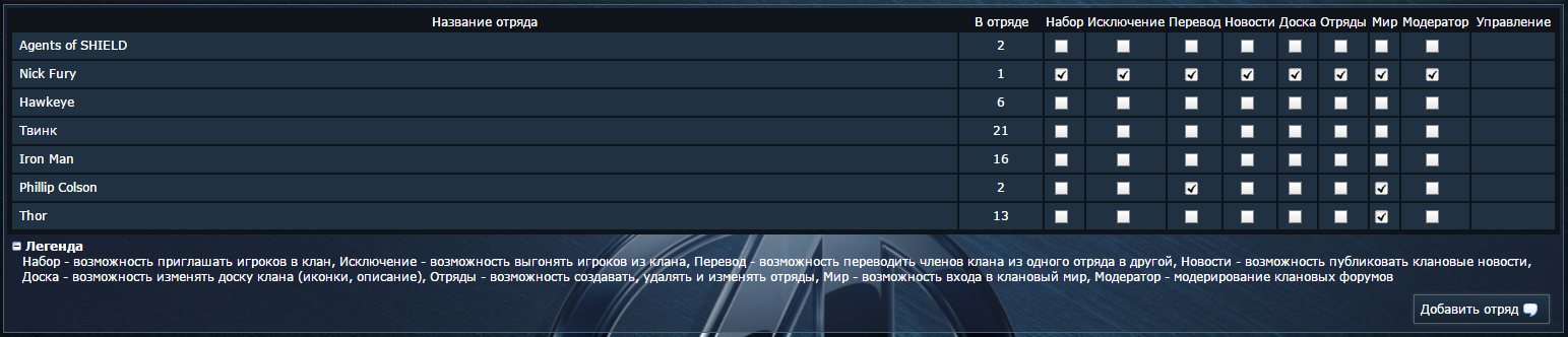 Рассмотрим разделение прав в клане в соответствии с отрядом. Рассмотрим на примере клана в котором я состою: