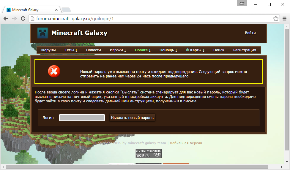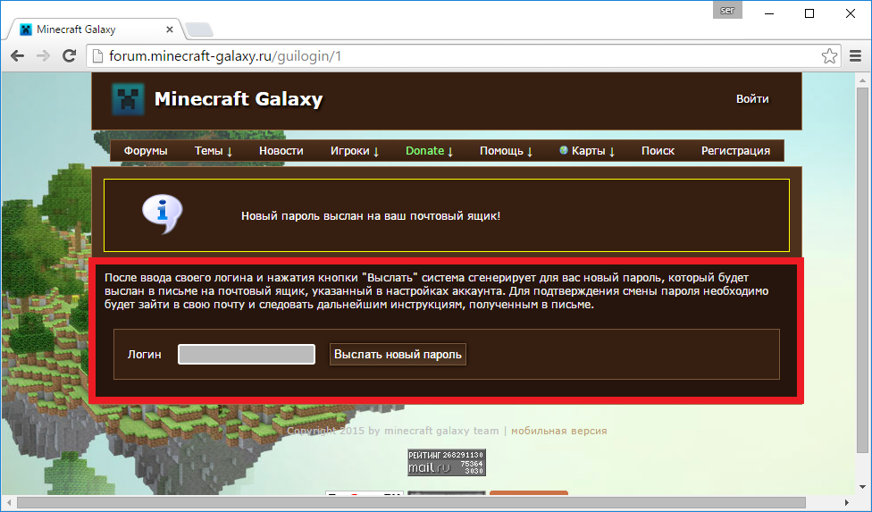 Вижу сообщение о уже отправленном письме на ящик, но опять же поля для введения логина и опять его ввожу