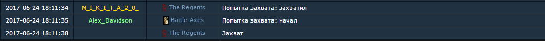Вот N_I_K_I_T_A_2_0_ начал захват,скрин - Вот N_I_K_I_T_A_2_0_ закончил захват,скрин - ----------------------------------------------------------------------------------Так в чем проблема та я не понел, все 61 секунд он простоял! А Alex_Davidson он начал захват после того как N_I_K_I_T_A_2_0_ взял крепу!Вот да же время 2017-06-24 18:11:34 N_I_K_I_T_A_2_0_ The Regents Попытка захвата: захватил 2017-06-24 18:11:35 Alex_Davidson Battle Axes Попытка захвата: начал |
