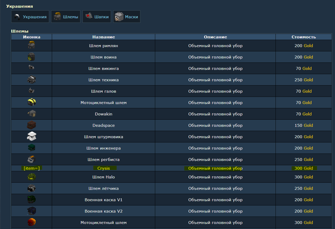 Зайдя на форум обнаружил что по ссылке на https://forum.minecraft-galaxy.ru/wiki/935 в разделе шлемы, он так же никак не обозначен