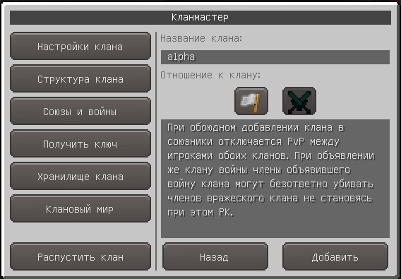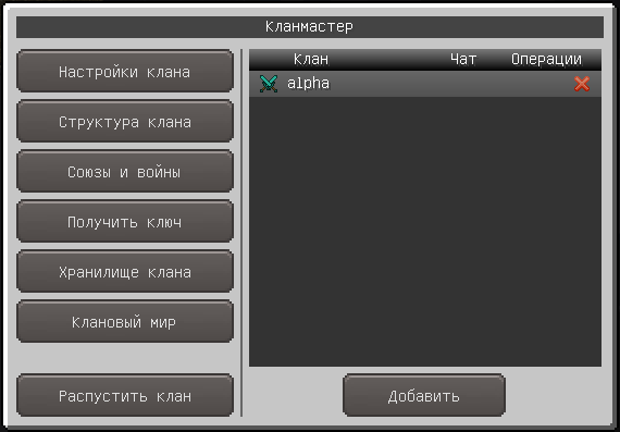 Для добавления другого клана в этот список лидер должен нажать на кнопку "Добавить", в появившемся окне ввести название добавляемого клана, выбрать тип отношения к клану (союз или война) и снова нажать кнопку "Добавить".