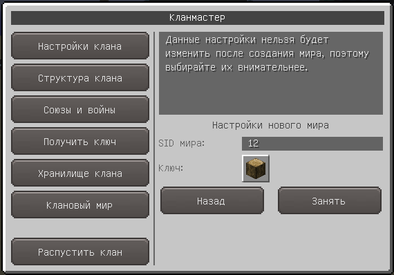 После выбора свободного мира, лидер клана может выбрать опции покупки, влияющие на начальную стоимость мира и его базовые настройки (SID карты и блок для телепортации в мир через портал):