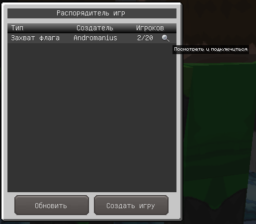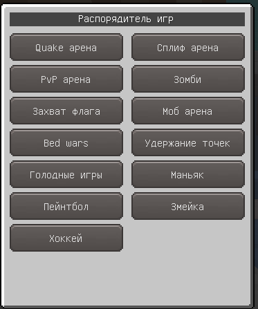 Специальный ивентовый инспиратор планеты MiniGames, предлагающий игрокам создать или присоединиться к одной из игр: Quake арена, Сплиф арена, PvP арена, Зомби, Захват флага, Моб арена, BedWars, Удержание точек, Голодные игры, Маньяк, Пейнтбол, Змейка и Хоккей.