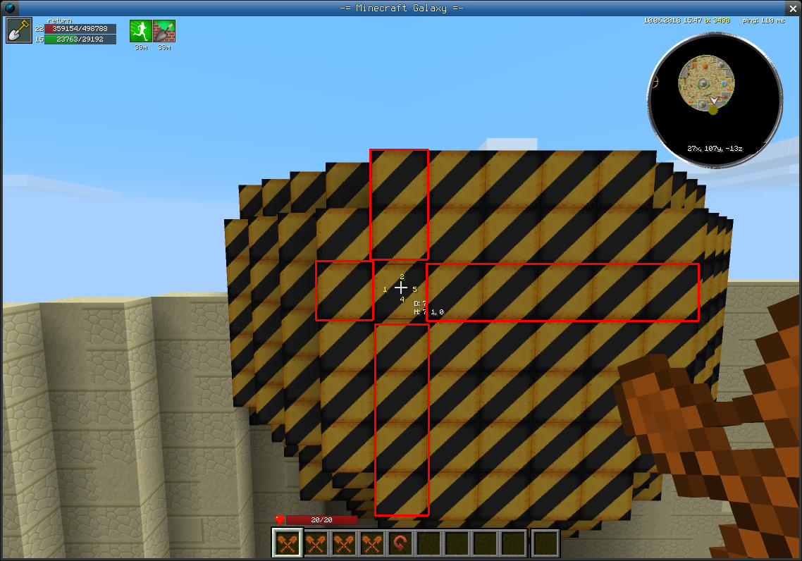1) дальность взаимодействия с блоками увеличивается до 96, что видно по появляющейся на блоках рамки выделения: