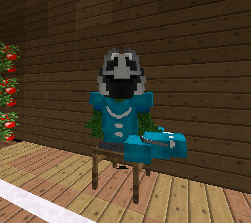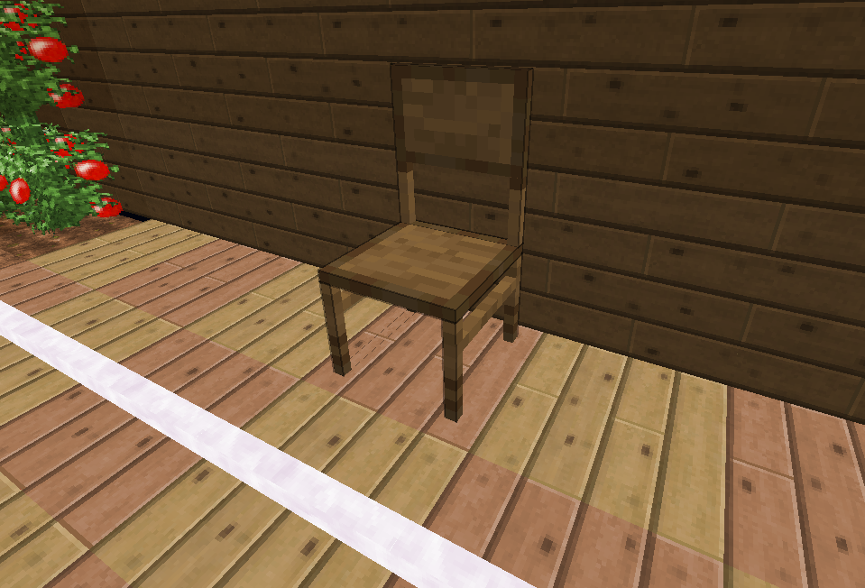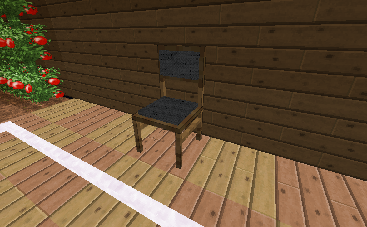 Устанавливается деревянный стул в 4х направлениях и может комплектоваться подушкой любого цвета. Для вставки подушки нужного цвета, необходимо кликнуть ковром в руке по стулу. Стоит учесть, что игрок не может усесться на стул подобно лодке или вагонетке, но может сесть на него с помощью нажатия на клавишу Х, находясь на стуле. Клик пустой рукой по стулу вынимает вставленный в него ковер и возвращает в руку игрока.
