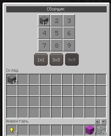 Как и блок рынок, имеет склад на 36 слотов и витрину на 9, при этом каждый слот вмещает до 128 блоков.