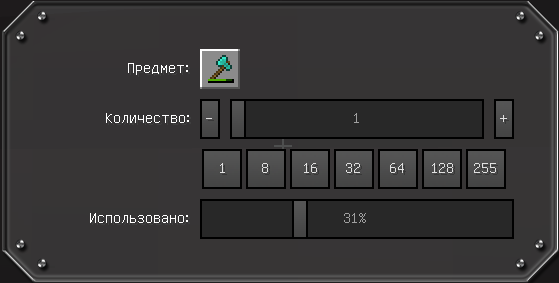 Владелец может задать допустимый уровень поломки принимаемого предмета. Например, в данном случае блок примет алмазный топор, использованный не более, чем на 31%.