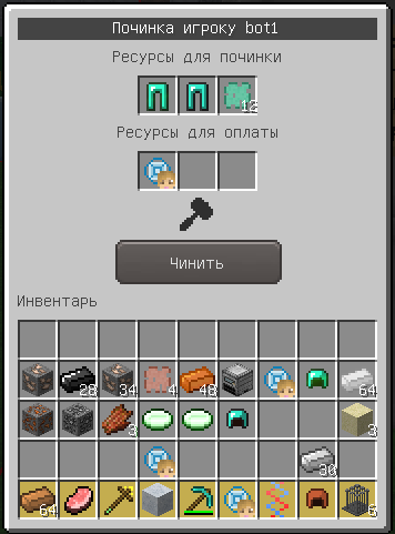 Игрок, который хочет починить предмет должен выложить в соответствующие слоты броню для починки, оригинал брони без улучшений и плату за услугу, после чего нажать Чинить: