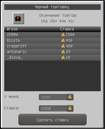 У каждого предмета есть начальная ставка. Задача игроков перебить ставку предыдущего участника. В случае, если до конца торгов ставка останется в лидерах, то игрок получает этот предмет с помощью Посыльного. Стоит учесть, что предметы и ставки для всех серверов общие, т.е. сделав ставку на одном сервере, вы будете видеть её на всех серверах и сможете в любой момент её поднять.